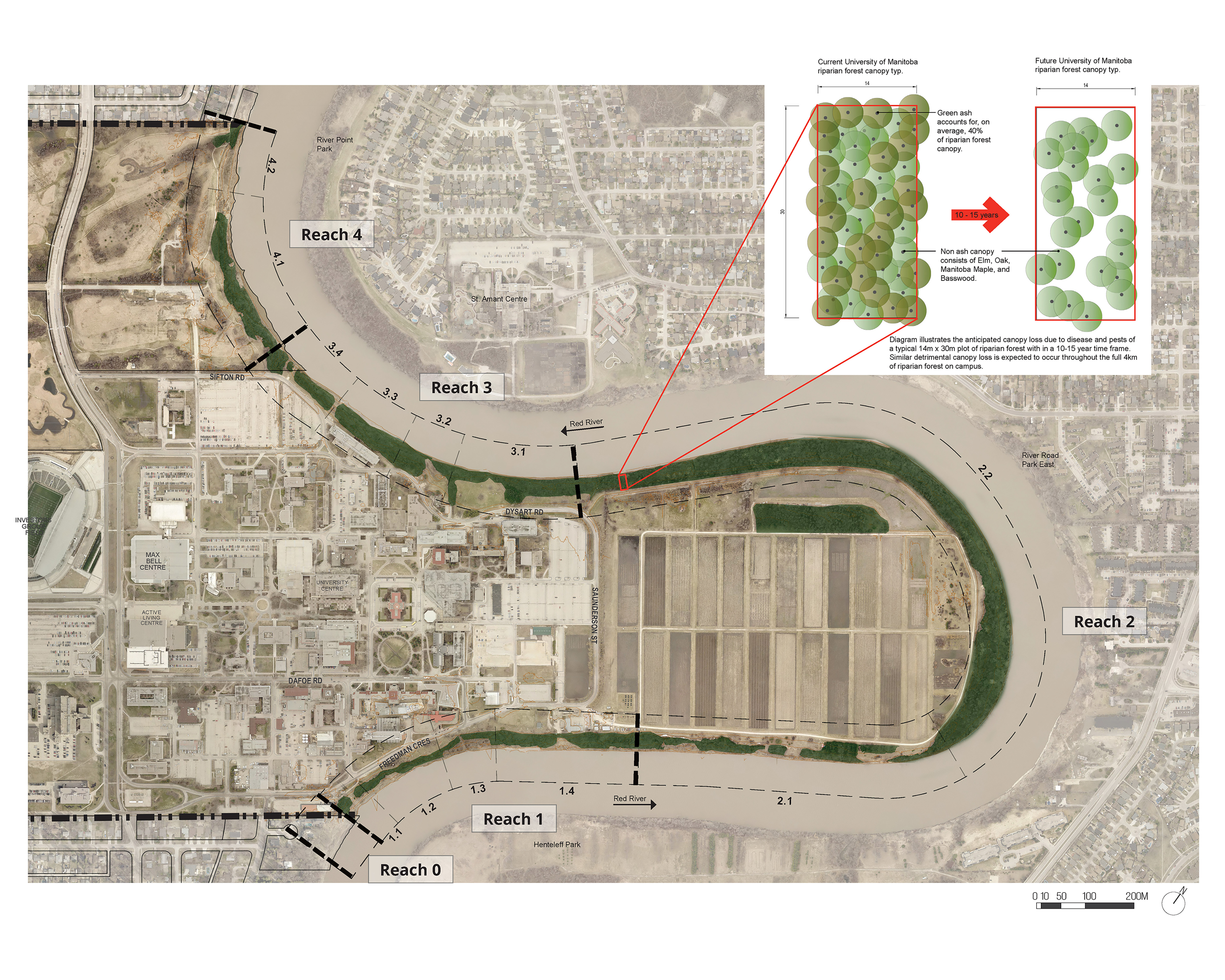 Aligning with the UM’s sustainability principles, KGS Group provided the university with a 15-year, phased riverbank management strategy that favours restoration of the riparian corridor with naturalized solutions. Integrating geotechnical and ecological concepts, the riverbank management plan is a comprehensive tool to help the university manage risk, promote riverbank health and preserve critical infrastructure. The plan mirrors the dynamic nature of the river, allowing for updates over time to reflect changes to the riverbank and the campus itself.