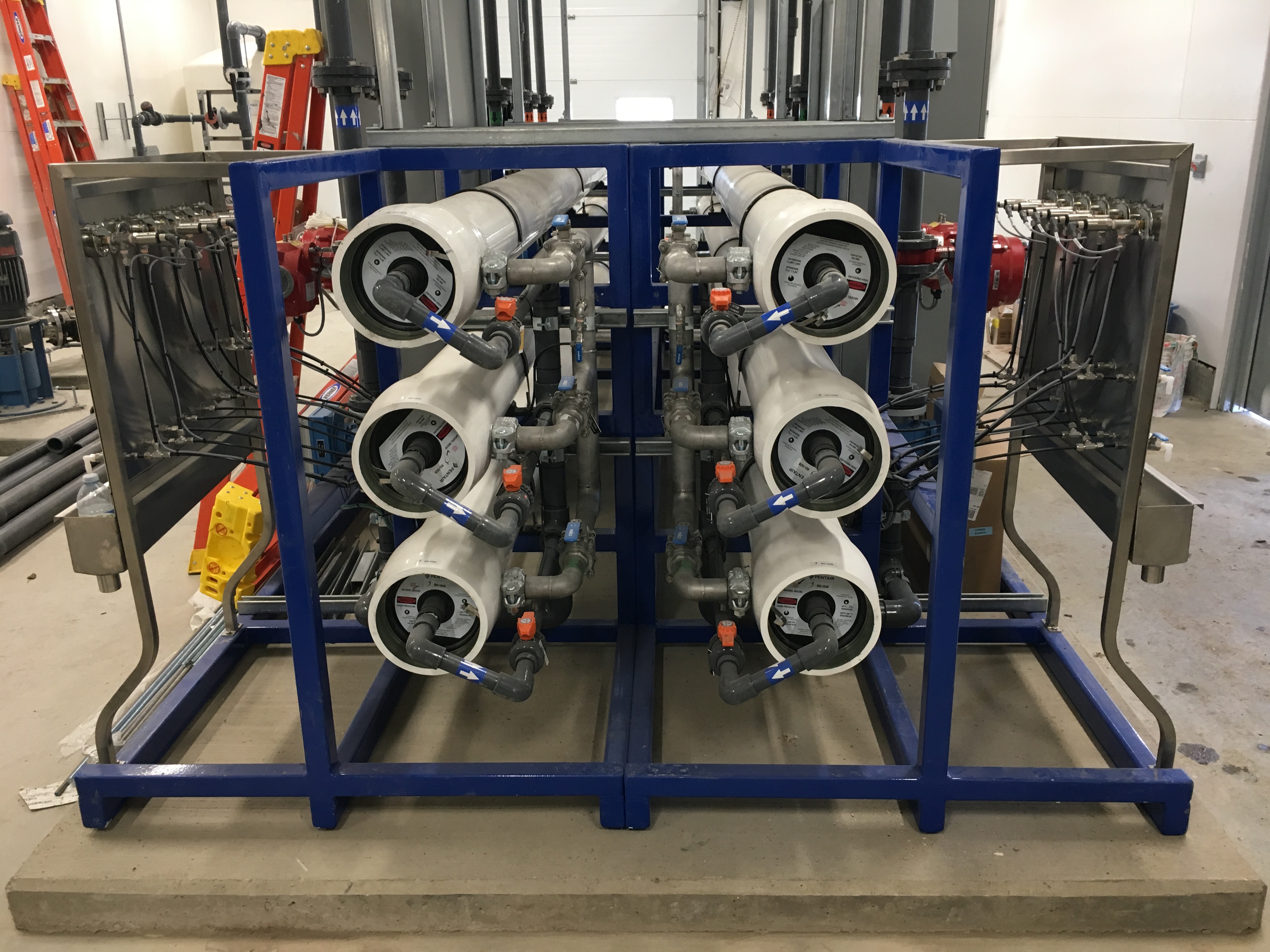 To increase the palatability of the finished water, KGS Group was retained to provide detailed design services for a brand-new water treatment plant using reverse osmosis membranes. A pilot study was first conducted to determine if direct feeding the reverse osmosis membranes from the wells would be an acceptable long-term solution. The pilot study had great success and the final design for direct feed membranes was completed in early 2019. The work also included design and construction of a new below grade concrete reservoir, building and vertical turbine distribution pumps.
